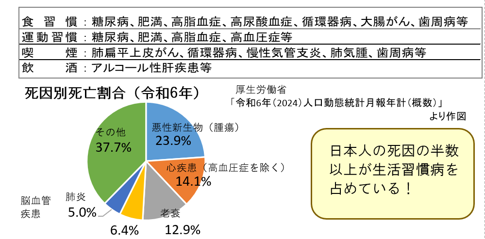 生活習慣病は、「食習慣、運動習慣、休養、喫煙、飲酒等の生活習慣が、その発症・進行に関与する疾患群」のこと。